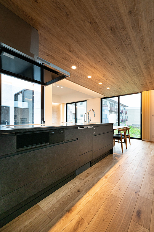 高級感が漂うダークグレーのキッチンと木目の天井