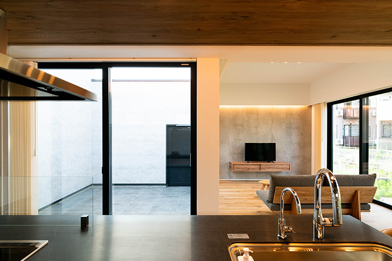 中庭をコの字型に囲み、キッチンから全体を見渡せる
