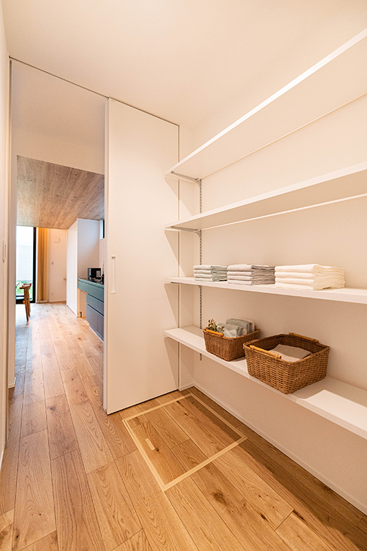 キッチンに隣接して広めのパントリーを設けた。食材のストックや普段使わない家電などの収納に役立つ