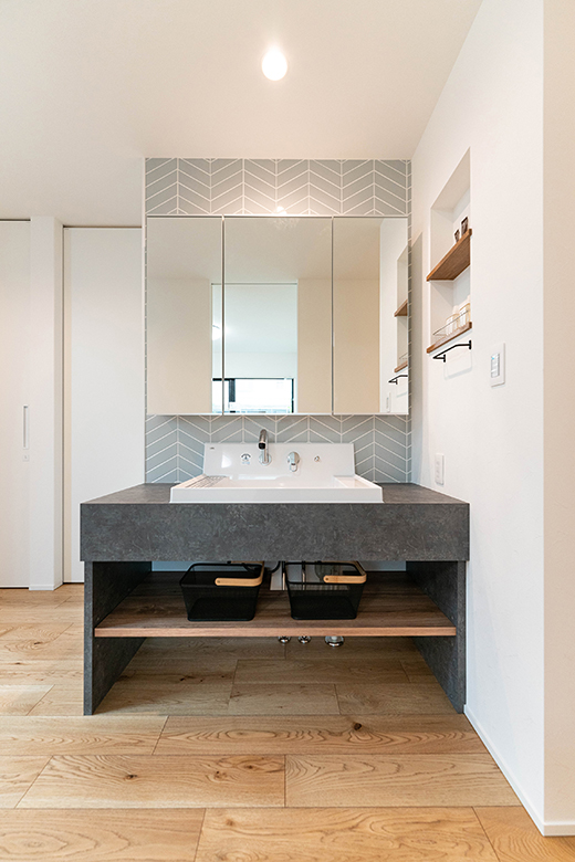 オリジナルの洗面化粧台は側面の壁にニッチも付けて使い勝手が良い。ホールスペースに独立しているので来客にも気兼ねなく使ってもらえる