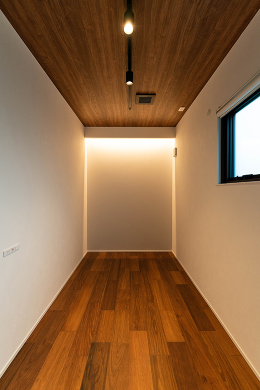 板張り天井と間接照明に癒やされる書斎スペース