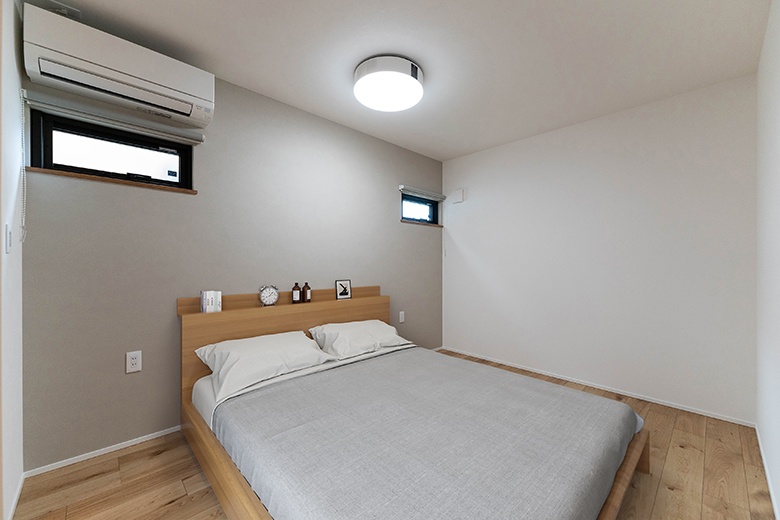リラックスして過ごす寝室空間にも馴染む落ち着いた色味のアクセントクロス
