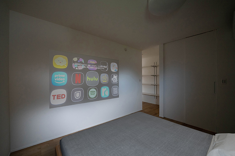 寝室の壁に天吊式のプロジェクターを投影してシアタールームに早変わり