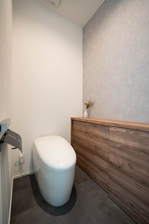 木目の収納カウンターを備えた機能的なトイレ