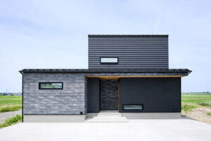 シックな黒のガルバリウム鋼板とやさしく中和してくれるベージュの外観。