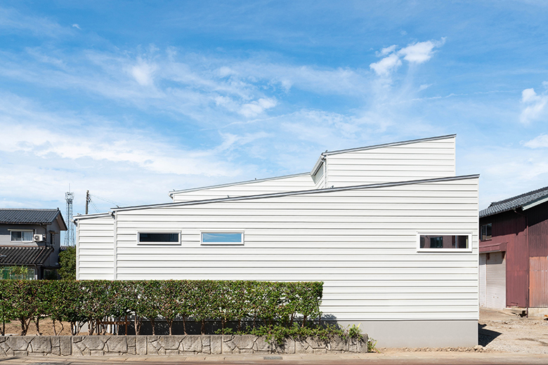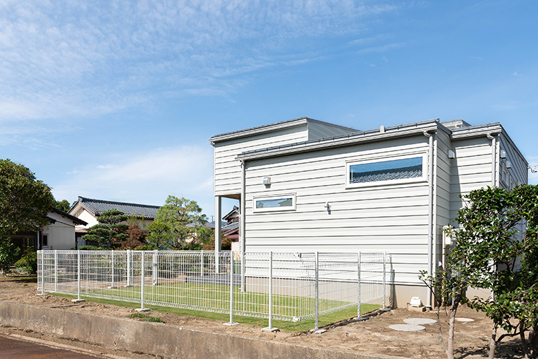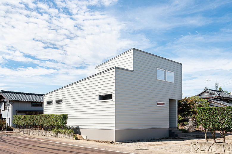 片流れ屋根にホワイトのガルバリウムを貼ったシンプルな外観