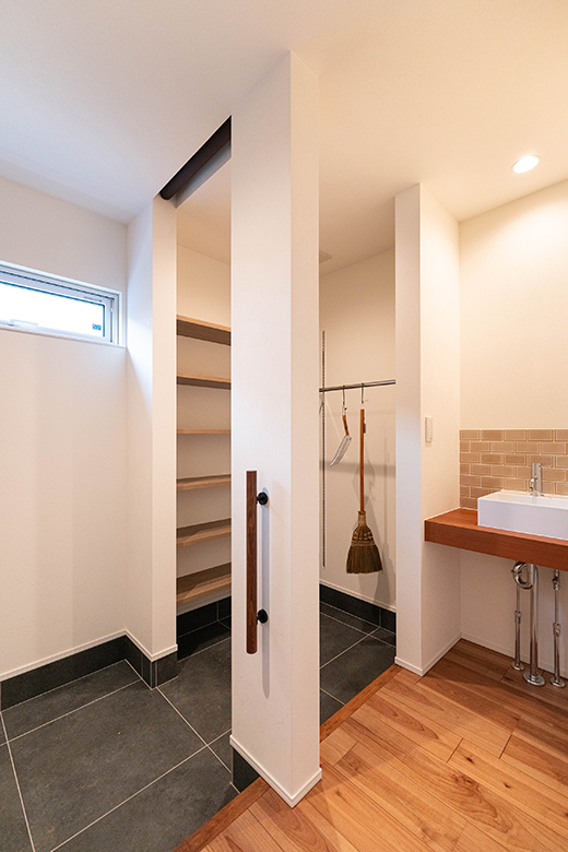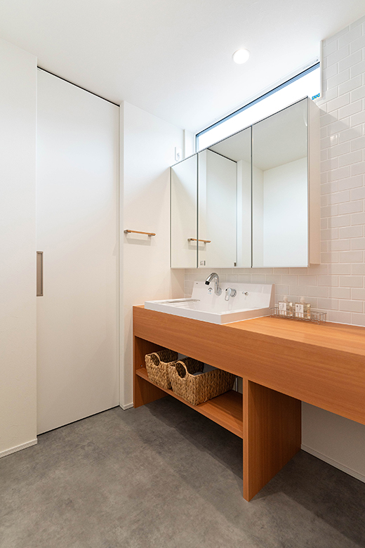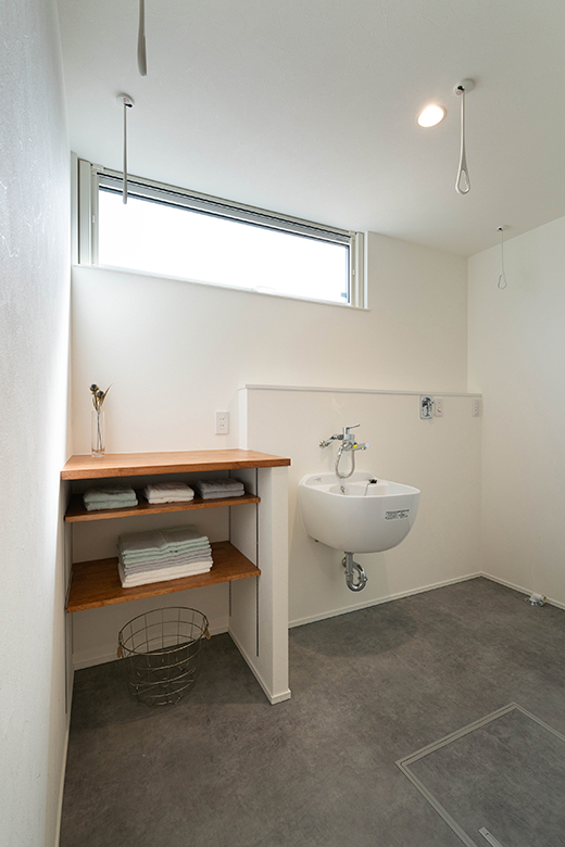 脱衣室は室内干しもできる他、スロップシンクや造作のカウンターや可動棚を備え機能的に使える