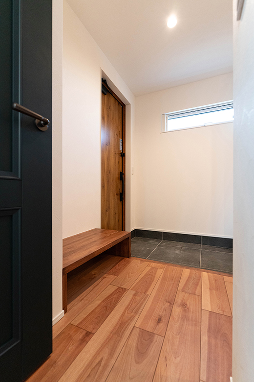 造作のベンチは靴の脱ぎ履きや行き帰りの荷物置き場として役立つ