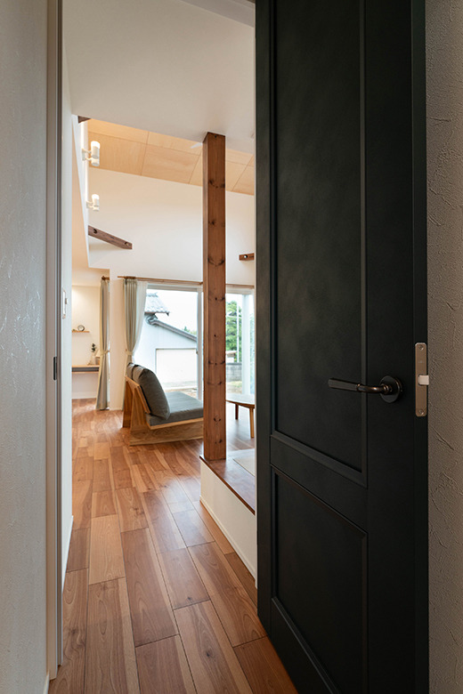 道路側は窓を少なくして玄関を奥に配置し、防犯とプライバシーに配慮