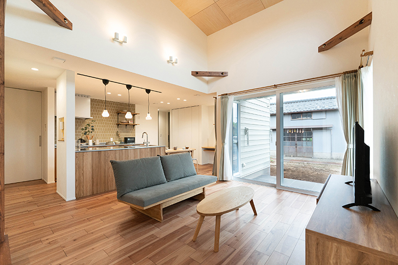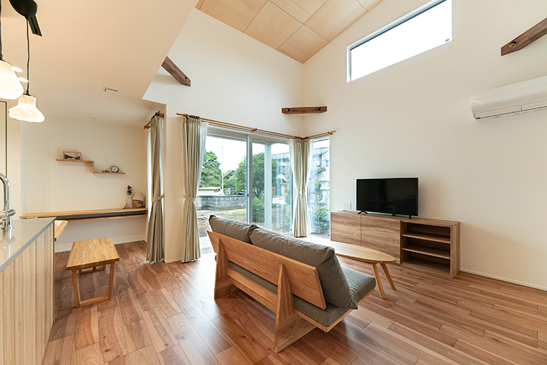 ナチュラルテイストのLDK。平屋ならではの高天井が開放的な空間を作り出す