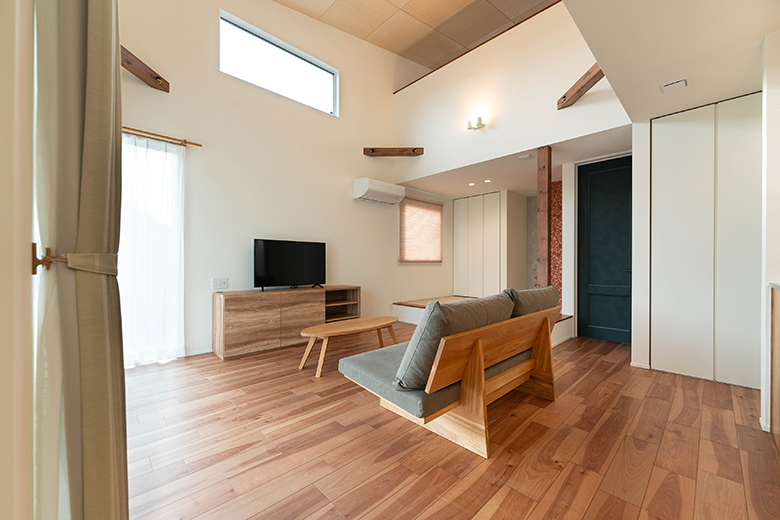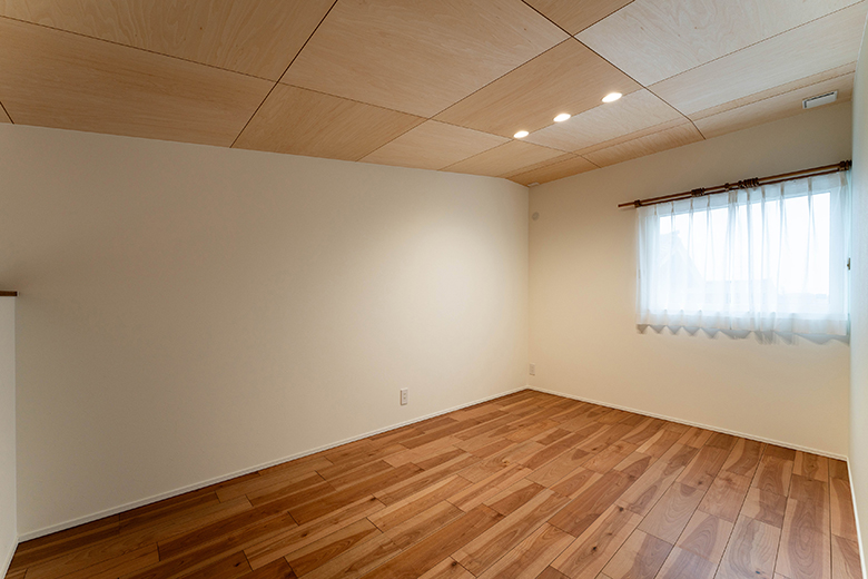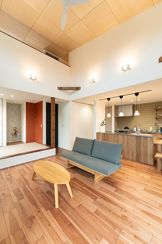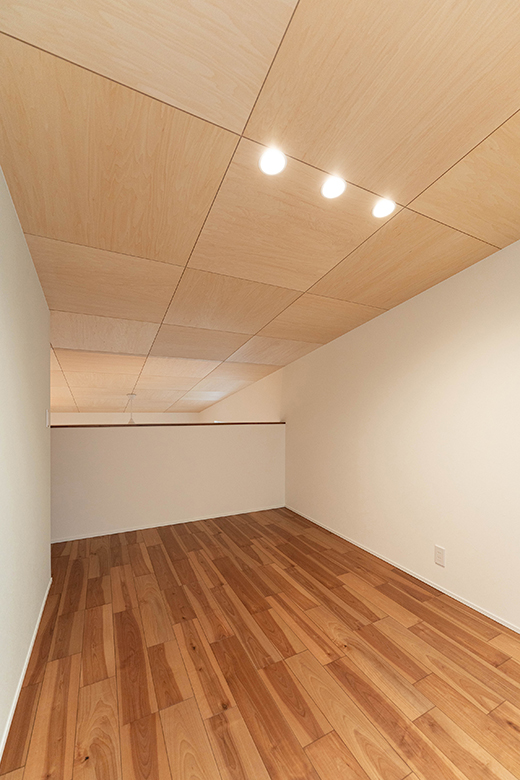 吹抜けの天井にはシナ合板を貼り、木のぬくもりをプラス