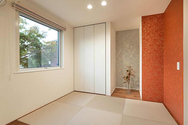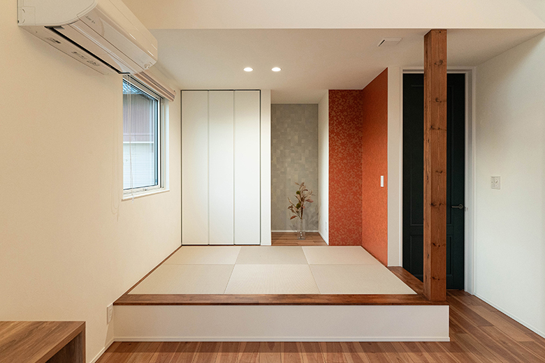 小上がりの畳コーナーは床の間もあり、部分的に異なる柄のクロスを貼り和モダンテイストが引き立つ