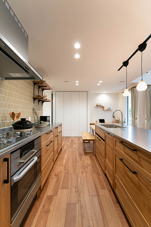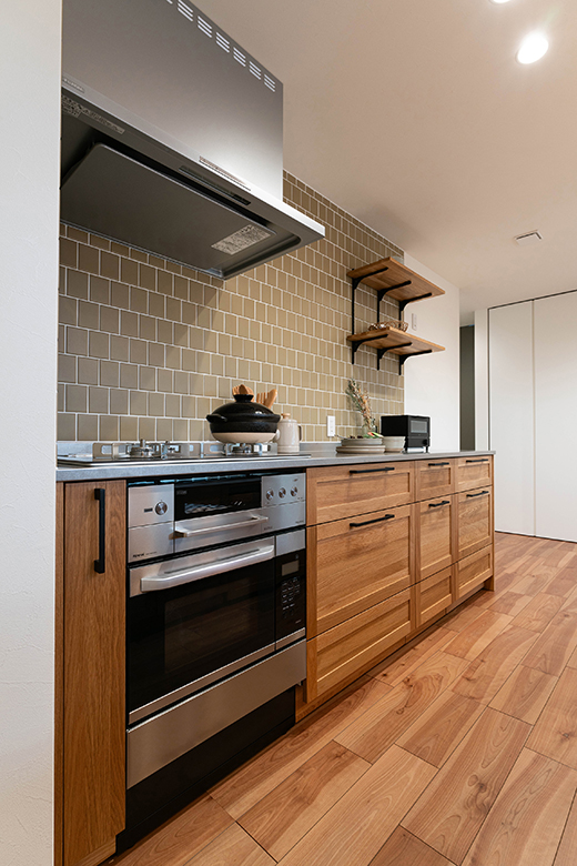 コンロ側の壁はタイル貼りが個性を演出し、木目との相性も抜群