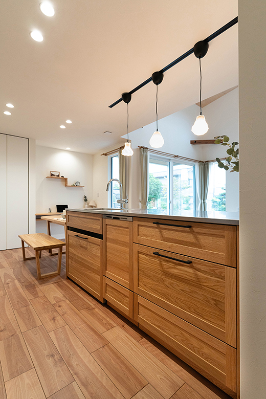 無垢材のオークで仕上げたこだわりのキッチン。
