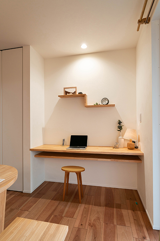 ダイニング横に設けた造作のカウンターは勉強やPC作業に便利。空間を彩る飾り棚もバランス良く配置