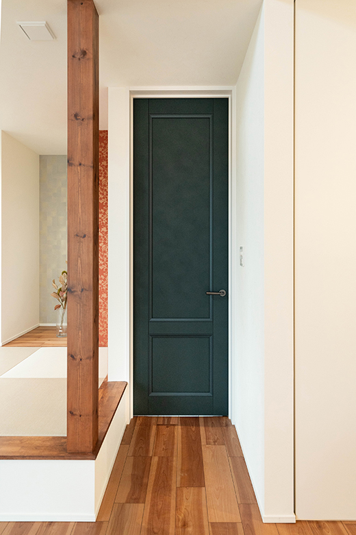 ボトルグリーンのリビングドアを開けるとLDKへとつながる