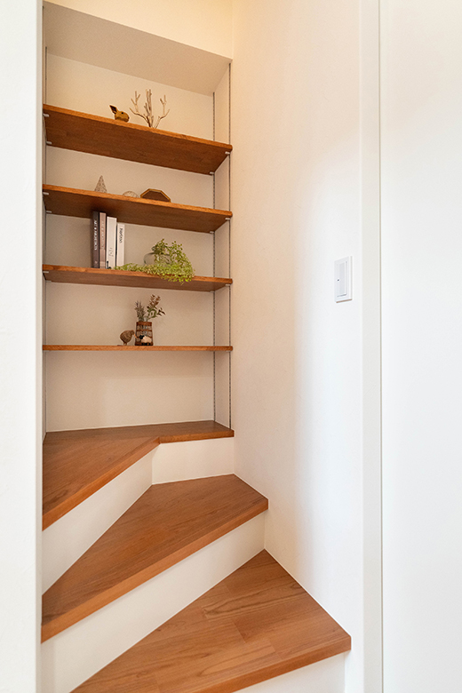 階段の途中に書棚として使えるニッチを設け、空間を無駄なく活用