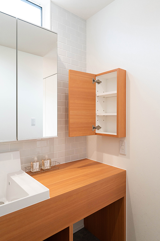 洗面台横には散らかりがちな洗面用具などをすっきり収納できる棚を設置
