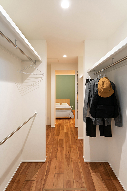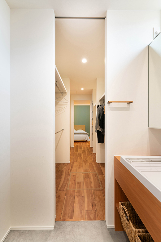 洗面室と寝室の間にウォークインクローゼットがあり、朝の身支度を最短距離で済ませられる