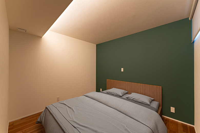 寝室はグリーンのアクセントクロスと間接照明で心から安らげる