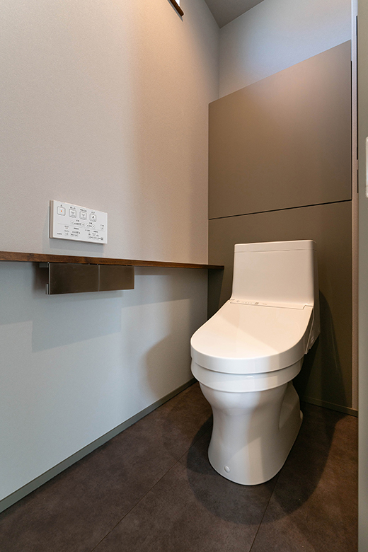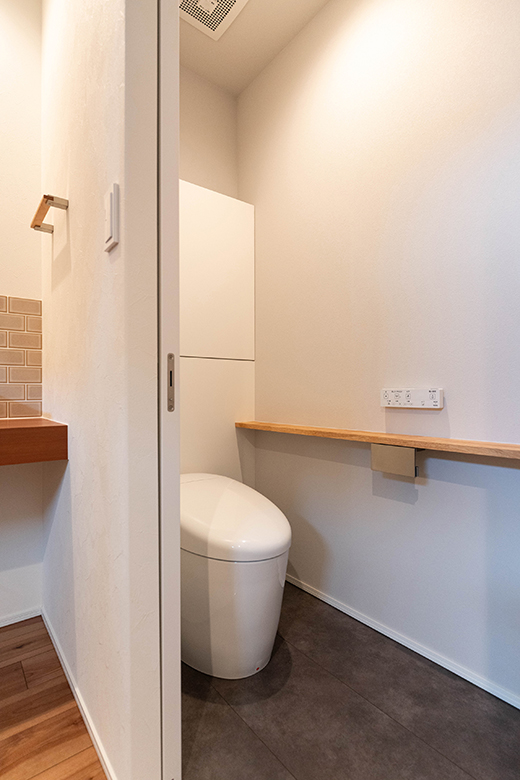 さりげなく造作の収納やカウンターを備え、デザイン性に優れたトイレ