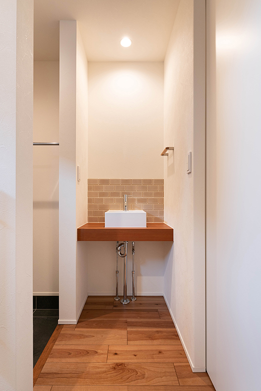 トイレ横にある手洗い器は玄関ホールにあるので来客にも気兼ねなく使ってもらえる