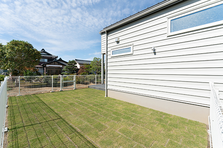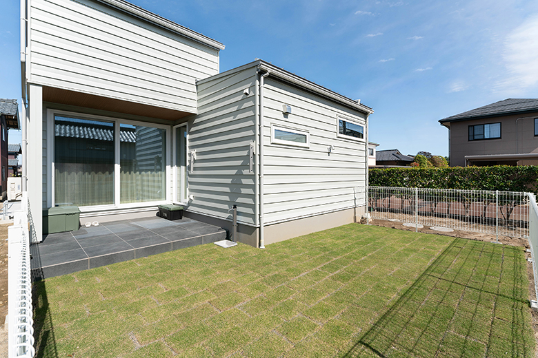 南向きでたっぷり日が注ぐタイルテラスとドッグラン。天然芝の風合いが美しく、夏の暑さも和らげる