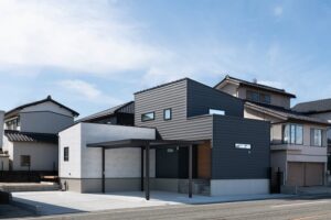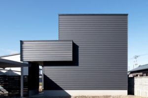 ホワイト・ブラックのガルバリウムをあわせたシンプルな外観。雪や雨が流れる方向や道路からの視線を考えた建物形状