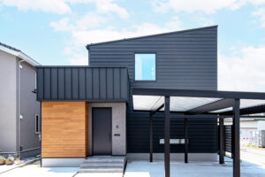 アシンメトリーの切妻屋根に黒いガルバリウム鋼板の外壁が特徴的な外観
