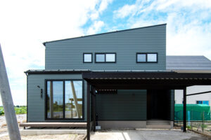 モダンなブラックサイディングの外観が目を引く、スタイリッシュな住まい。奥行きを感じさせる立体的なフォルムが、重厚感を与えている