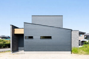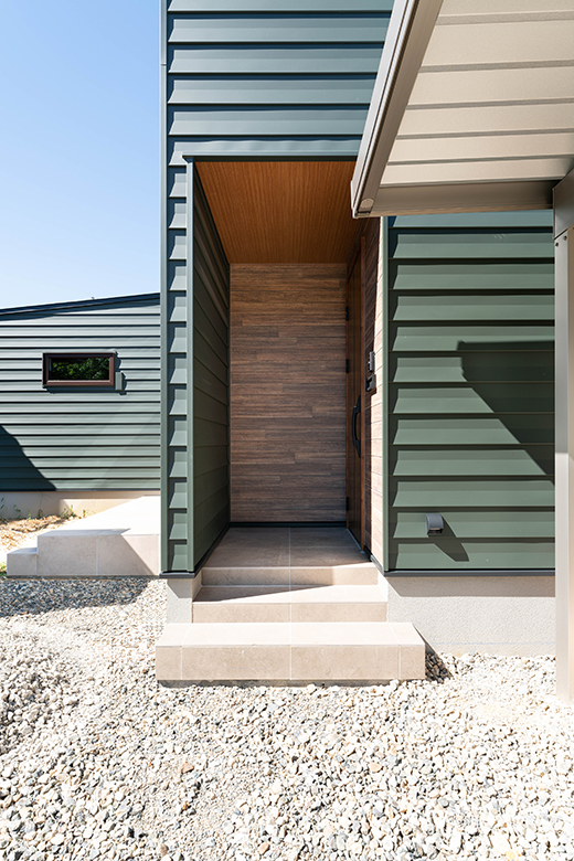 深い緑の外壁が自然と調和する落ち着きのある佇まい。片流れ屋根のデザインが個性的でありながら周囲の景観に溶け込む