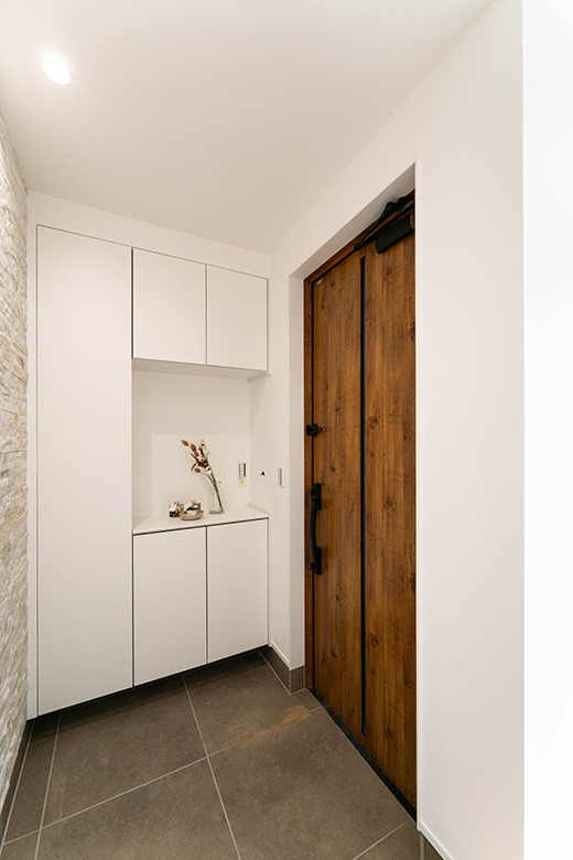 玄関を彩る石目調のアクセントウォール。落ち着いたベージュのトーンが空間に高級感と温かみを与え、優しく出迎えてくれる