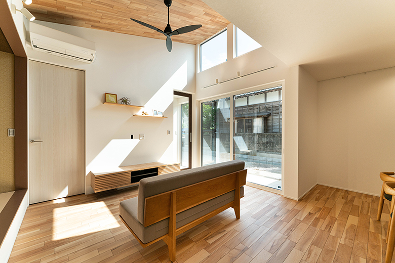 勾配天井が生み出す縦方向の広がりが、リビングをより開放的な空間に。木目の天井材がアクセントとなり、上質な空間を演出
