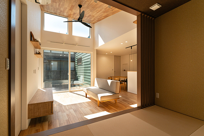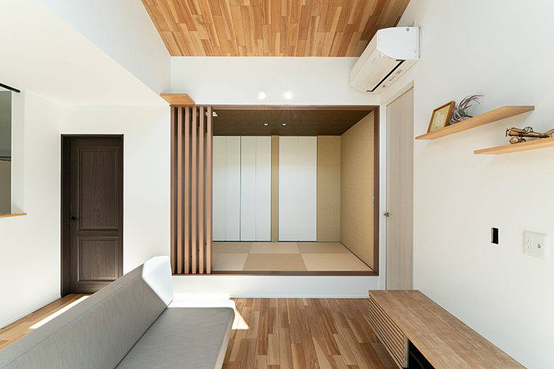 リビング横に配置された和室が、モダンな空間に和の落ち着きをプラス。縦格子の仕切りが緩やかなつながりを生み、空間のアクセントに