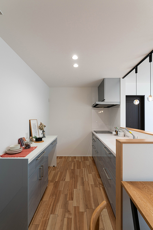 シンプルで機能的なキッチンスペース。木目調の床とグレーの収納が調和し、清潔感と落ち着きを感じさせる