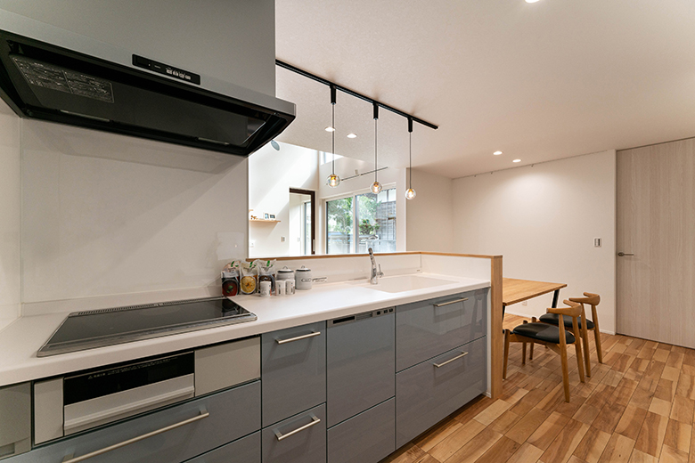 ペンダントライトが空間にアクセントを添えるダイニングキッチン。ナチュラルな木の風合いが、明るく開放感のある空間に調和