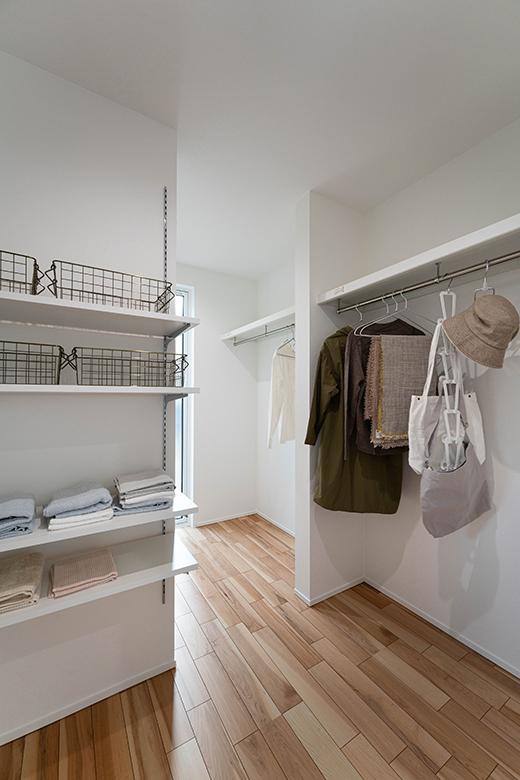 広々としたウォークインクローゼット。ハンガーパイプとオープン棚の組み合わせで、衣類から小物まで効率的に収納可能