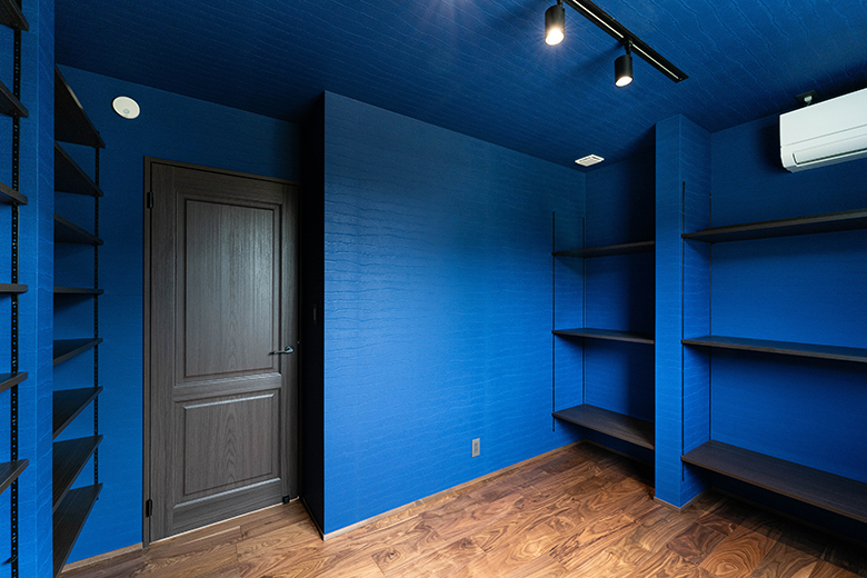 鮮やかなブルーの壁紙が印象的な書斎スペース。収納棚と木目の床がバランス良く調和し、使いやすさも魅力