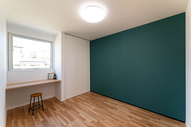 アクセントウォールの深いグリーンが印象的な子ども部屋。造作カウンターは勉強や作業にぴったりの設計