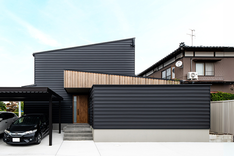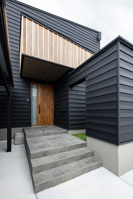 素材のコントラストが際立つエントランス。ブラックの外壁と無垢材の組み合わせが、重厚感と温かみを演出