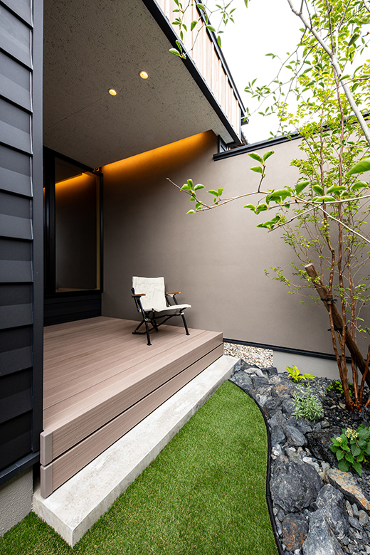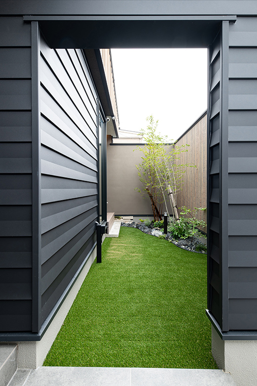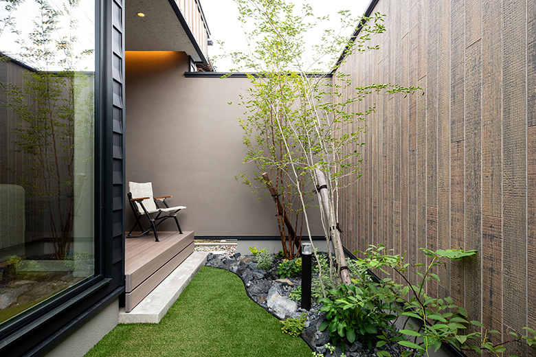 外部からの視線を遮りながら、自然を感じられるプライベートガーデン。黒い外壁と緑が美しく調和する空間