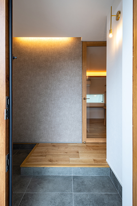陰影が美しいエントランス。上質な素材と間接照明が落ち着きのある迎えの空間を演出