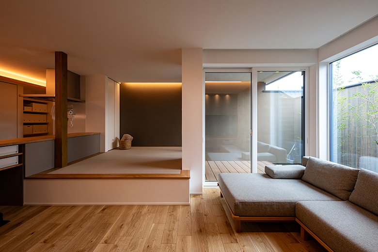 室内と屋外がゆるやかにつながる、心地よいリビング。間接照明が空間に奥行きを与え、落ち着いた雰囲気を演出