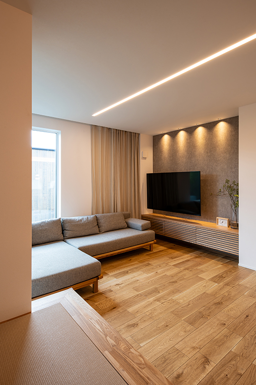 ライン照明と間接照明が織りなす、洗練されたリビング空間。木の温もりとモノトーンの質感が上品に調和