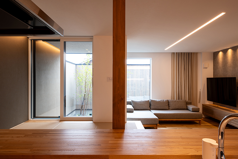 キッチンから広がる視界の先に、中庭の緑と落ち着いたリビング空間。暮らしの中心に、心地よい景色を