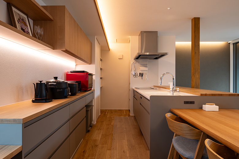 木の温もりとグレーの落ち着いた色合いが調和するキッチン。使い勝手と美しさを兼ね備えた