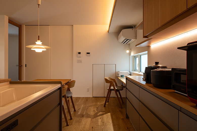 間接照明とペンダントライトが調和するダイニング。優しい光が、日常に上質なひとときをもたらす