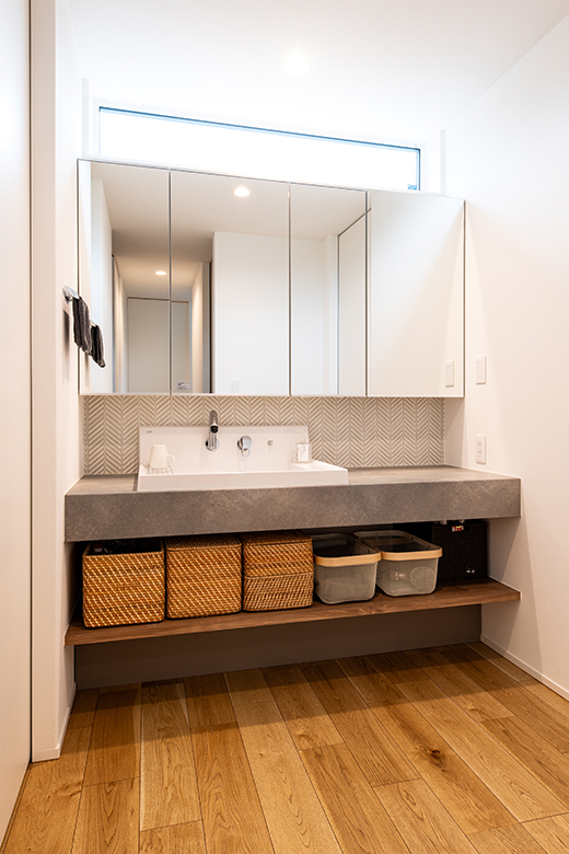 モルタル調の洗面カウンターとヘリンボーン柄のタイルが、上質な雰囲気を演出した造作洗面台