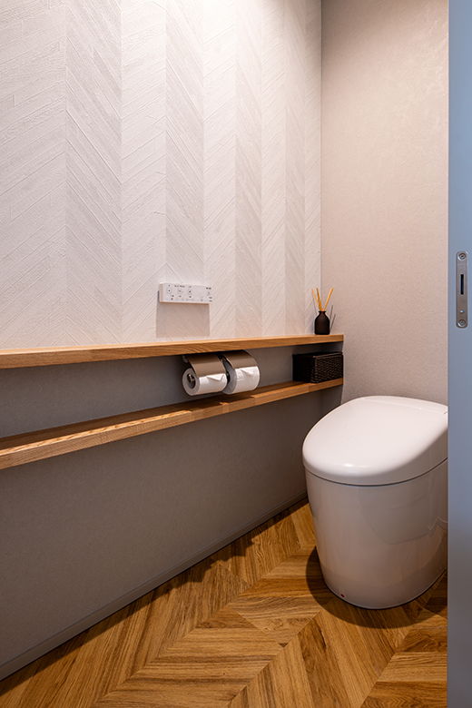 ヘリンボーン柄の床と立体感のあるクロスが織りなす、洗練されたトイレ空間