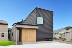 黒のガルバリウム鋼板をベースに、玄関アプローチに木目調の窯業系サイディングを使ってアクセントを利かせた外観